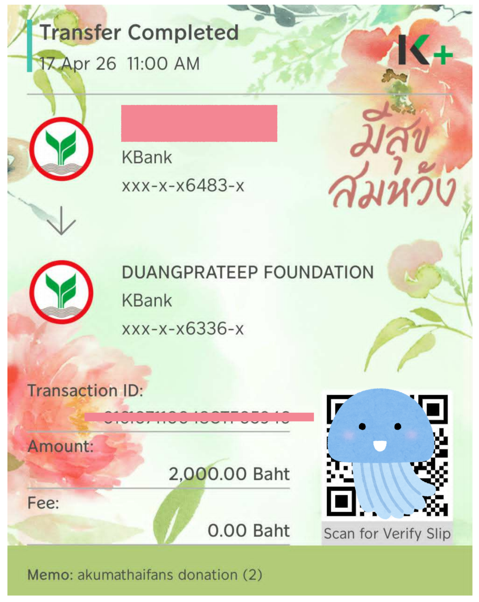 We donated 2,000 Thai Baht to Duang Prateep Foundation to support and provide educational opportunities for children in poor communities.