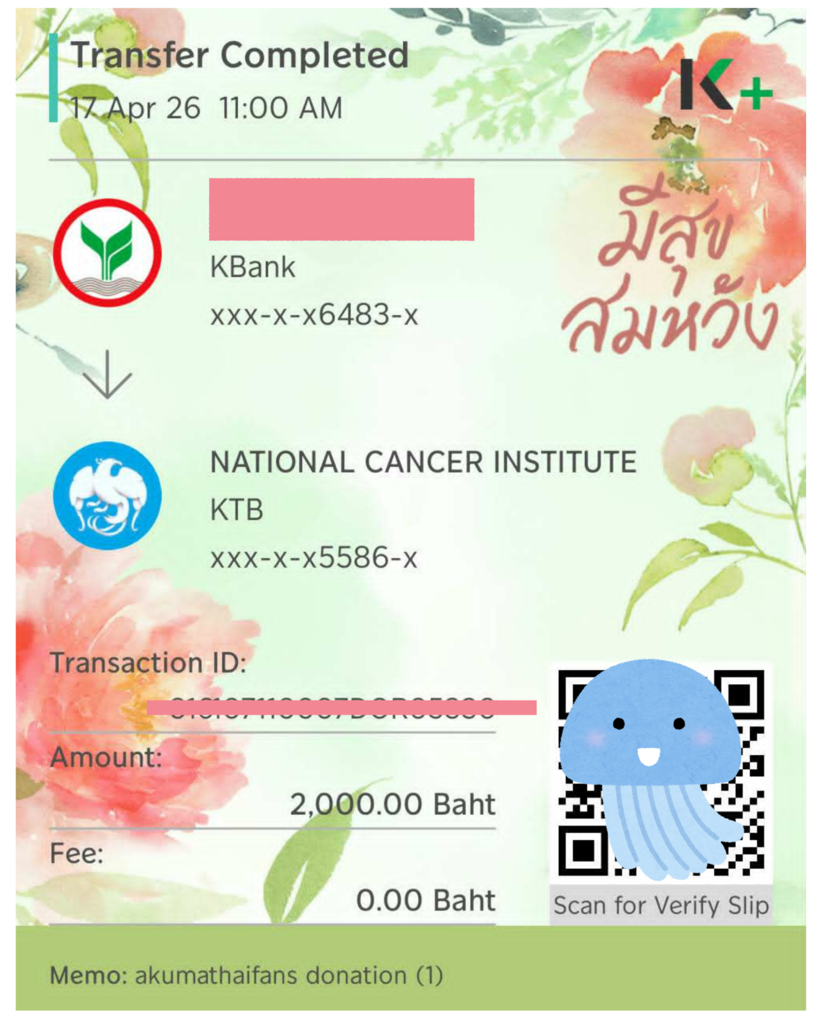 We donated 2,000 Thai Baht to National Cancer Institute to support their technologies in cancer prevention, and the care and rehabilitation of cancer patients.